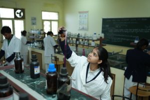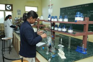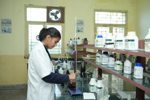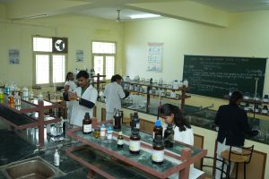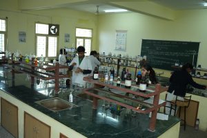 The Lab is provided with the state- of- the art devices like- Fume hood, Distillation unit, electronic weighing machine, Bunsen burners, beakers and flasks. Concealed gas line and the safety devices such as Firefighting equipment, First- Aid Kit etc. The acids and other reactive chemicals are stored in separate locked cupboards as a further precautionary measure. The students are provided with separate workstations with individual burners and plug points. The apparatus includes the common place strikers, mortar and pestle, clay triangles, watch glasses, crucibles, crucible tongs, chemical spoon, stirring rods, filter funnels and a variety of stoppers.